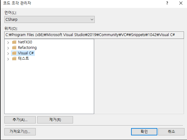 2. vs2019 도구->코드조각 관리자(영어로는 snippets 어쩌고) -> 가져오기 해서 위 폴더의 스니펫을 추가해줍니다